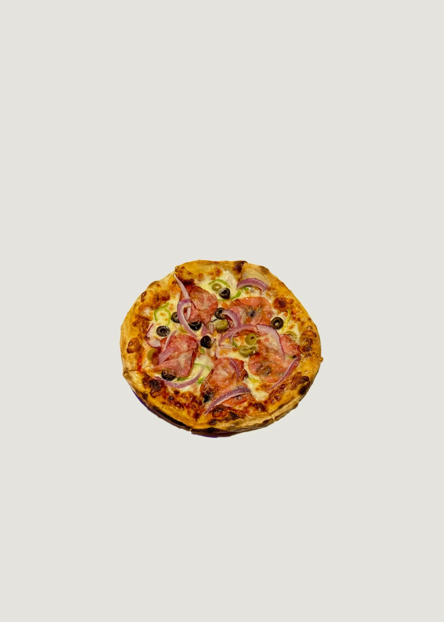 감칠맛 나는 올리브와 파프리카, 카포콜로 햄이 조화를 이루는 풍미 가득한 라운드 피자.