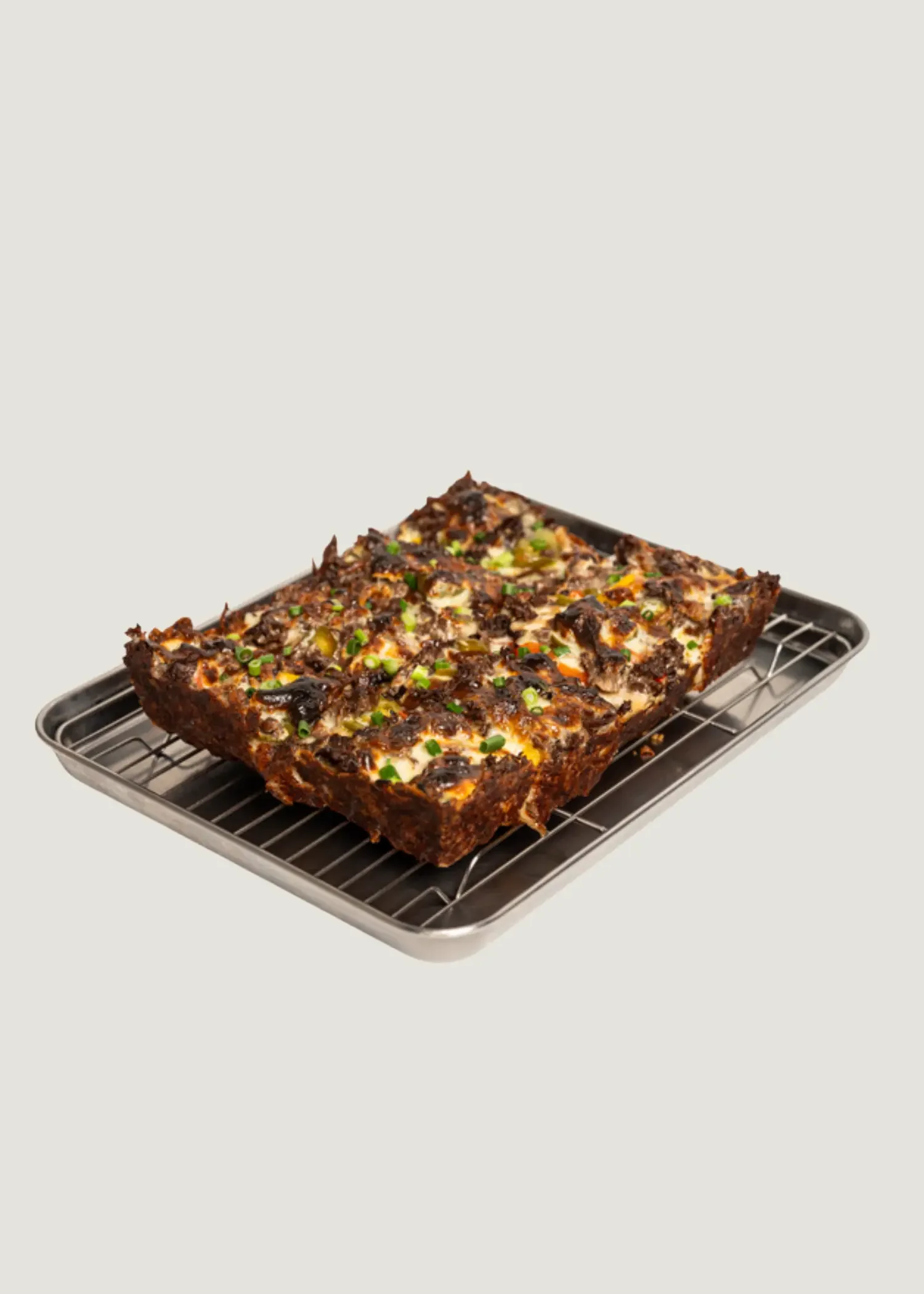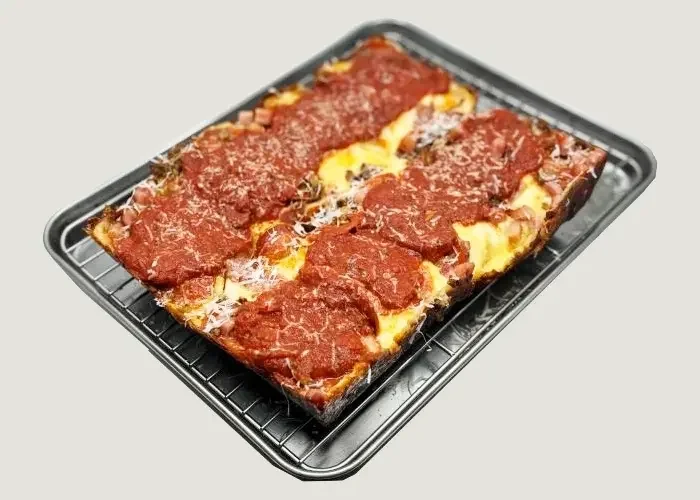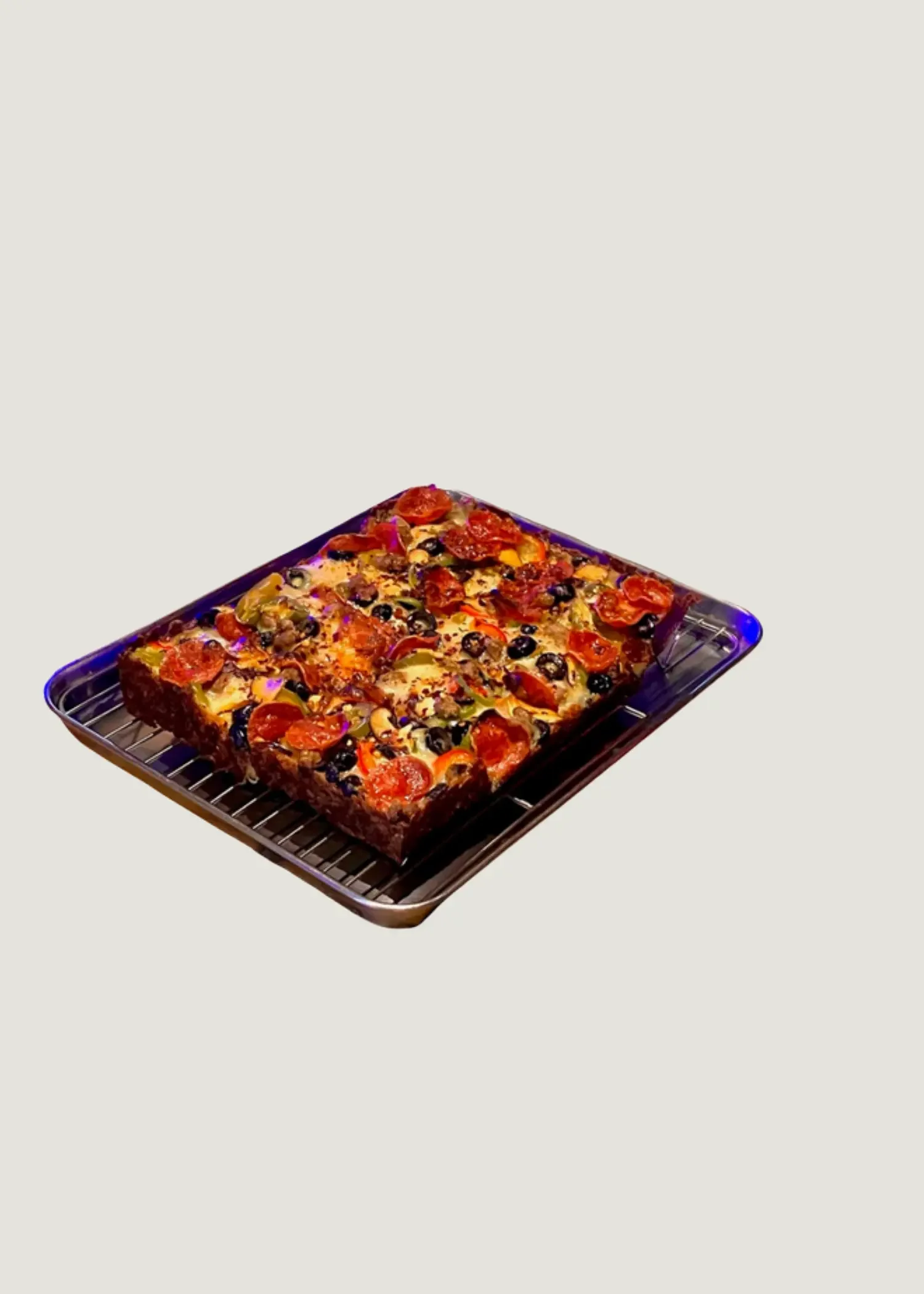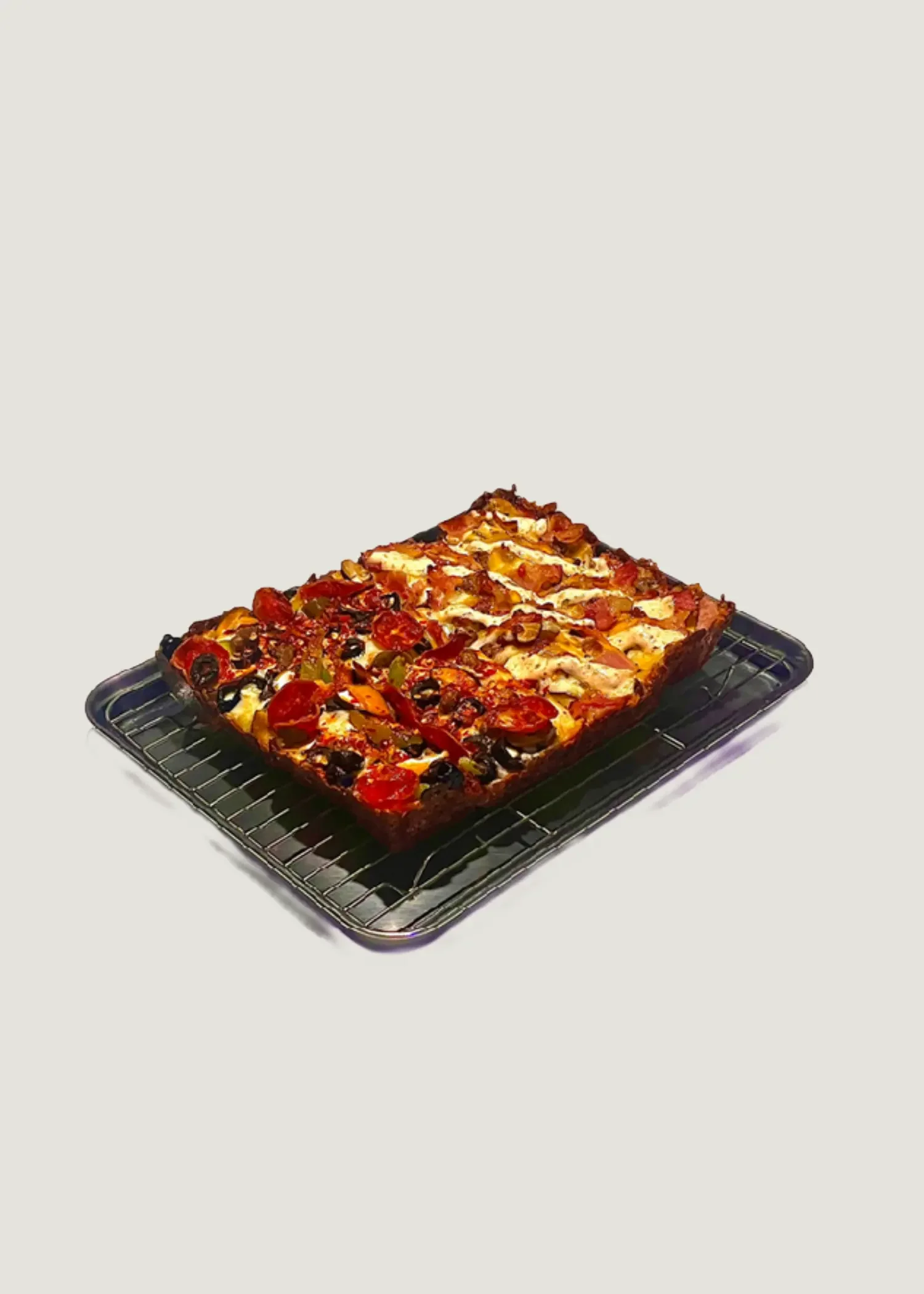 신선한 반죽을 매일 숙성·발효하여 사각 틀에 구워내는 바삭하고 촉촉한 디트로이트 스타일 피자입니다.